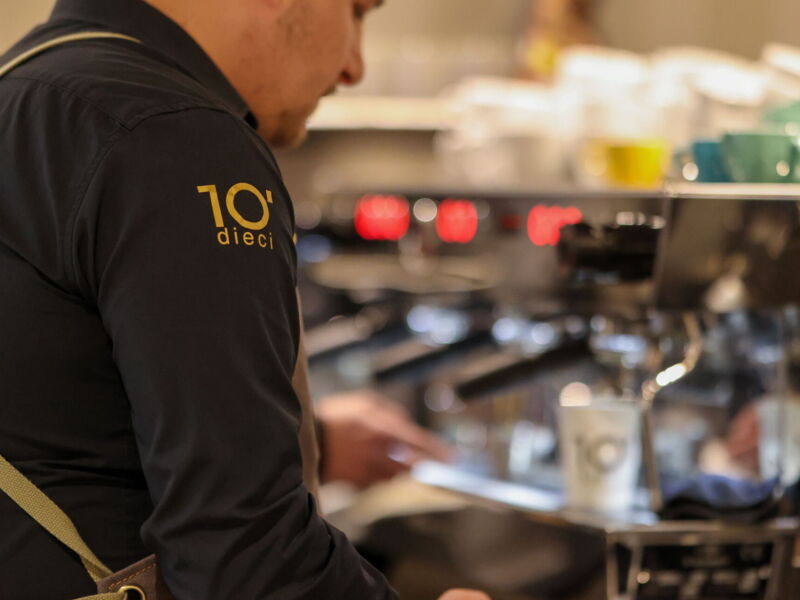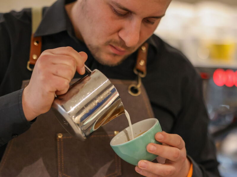 The first coffee is served immediately upon arrival. A cappuccino. Even using oat milk, which is difficult to foam, Fabio conjures up a perfect, caramel-coloured heart in our cups even before we sit down at one of the cosy wooden tables. Every move from the latte art world champion is perfect.