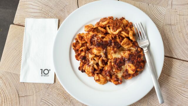 This dish combines two Italian specialities. Orecchiette is a hat-shaped durum wheat semolina pasta from Apulia, and it is the symbol of the city of Bari. Ragu is something that we typically call a Bolognese in English. As the name suggests, it comes from Bologna. The original recipe was recorded by the Accademia Italiana della Cucina at the Bologna chamber of commerce in 1982, and is now famous across the globe. This popular dish is now finally available at dieci.