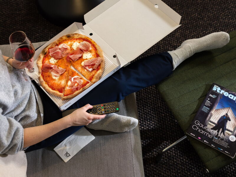 A relaxing evening watching TV with your loved one, enjoying creamy pasta al forno and a lovely glass of wine, is simply good for you. Or you could make it a cosy evening in with your best friend. Whether it is a romantic comedy or an exciting action film, crispy pizza or pasta al forno – the choice is wide.