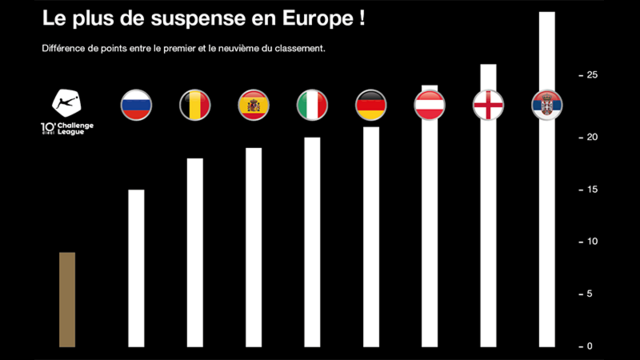 Une analyse le montre: la dieci Challenge League est le championnat le plus passionnant d’Europe! Dans aucune première division d’Europe, les clubs ne sont aussi proches les uns des autres. En Super League, par exemple, 28 points séparent le premier et le neuvième du classement. Et qu’en est-il des grands championnats suivis dans le monde entier? La Primera División espagnole compte 19 points d’écart, la Serie A italienne 20 points, la Bundesliga allemande 21 points et la Premier League anglaise 27 points! Seule la National Division luxembourgeoise se rapproche de la Challenge League en termes de suspense (12 points).